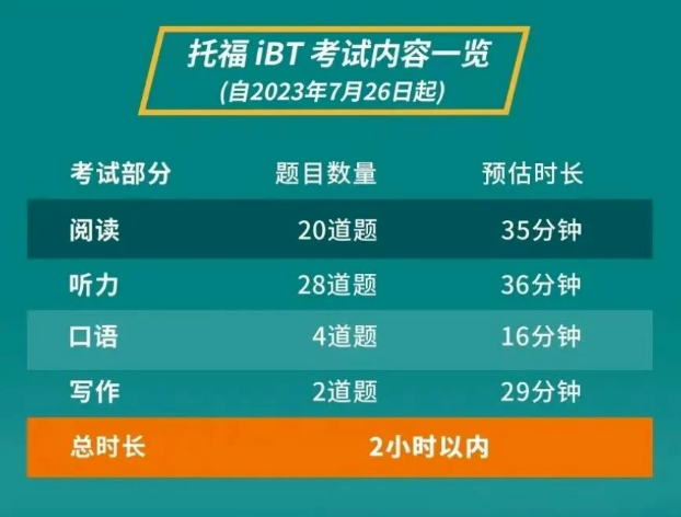 2023-08-14 10:45 | 编辑:川外外语培训中心 来自:未知导读:前不久,全新升级的托福考试结束,ETS官方果然是兑现了所有承诺:阅读部分减少一篇,并且取消加试;取消了休息;独立写作题替换为学术讨论题;而且整场考试真的缩短至2小时!Go further, FASTER,这句口号没白喊改版后的托福更快,带你走的更远! 托福考试新